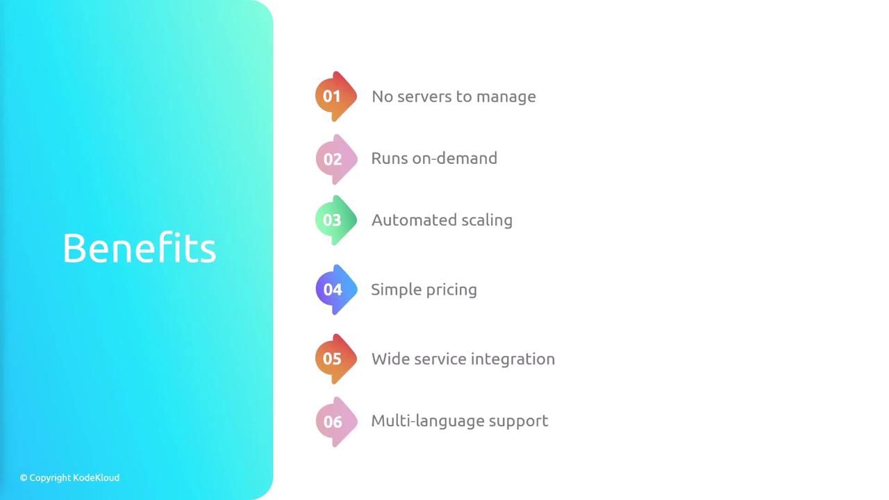 - No Server Management: Deploy functions that run on demand with no manual server provisioning or ongoing maintenance.