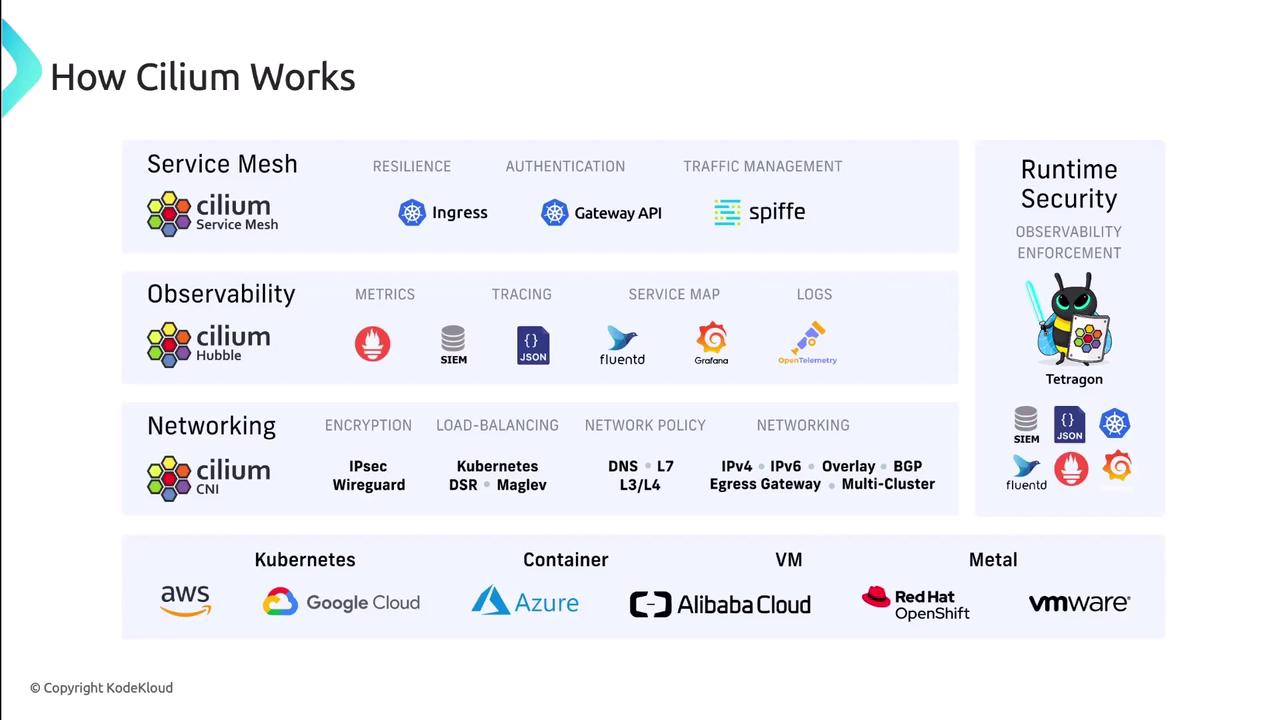 At its core, Cilium leverages eBPF to implement a high-performance, Layer 3 network that is protocol-aware at Layer 7. It can replace kube-proxy and enforce network policies at Layers 3, 4, and 7.