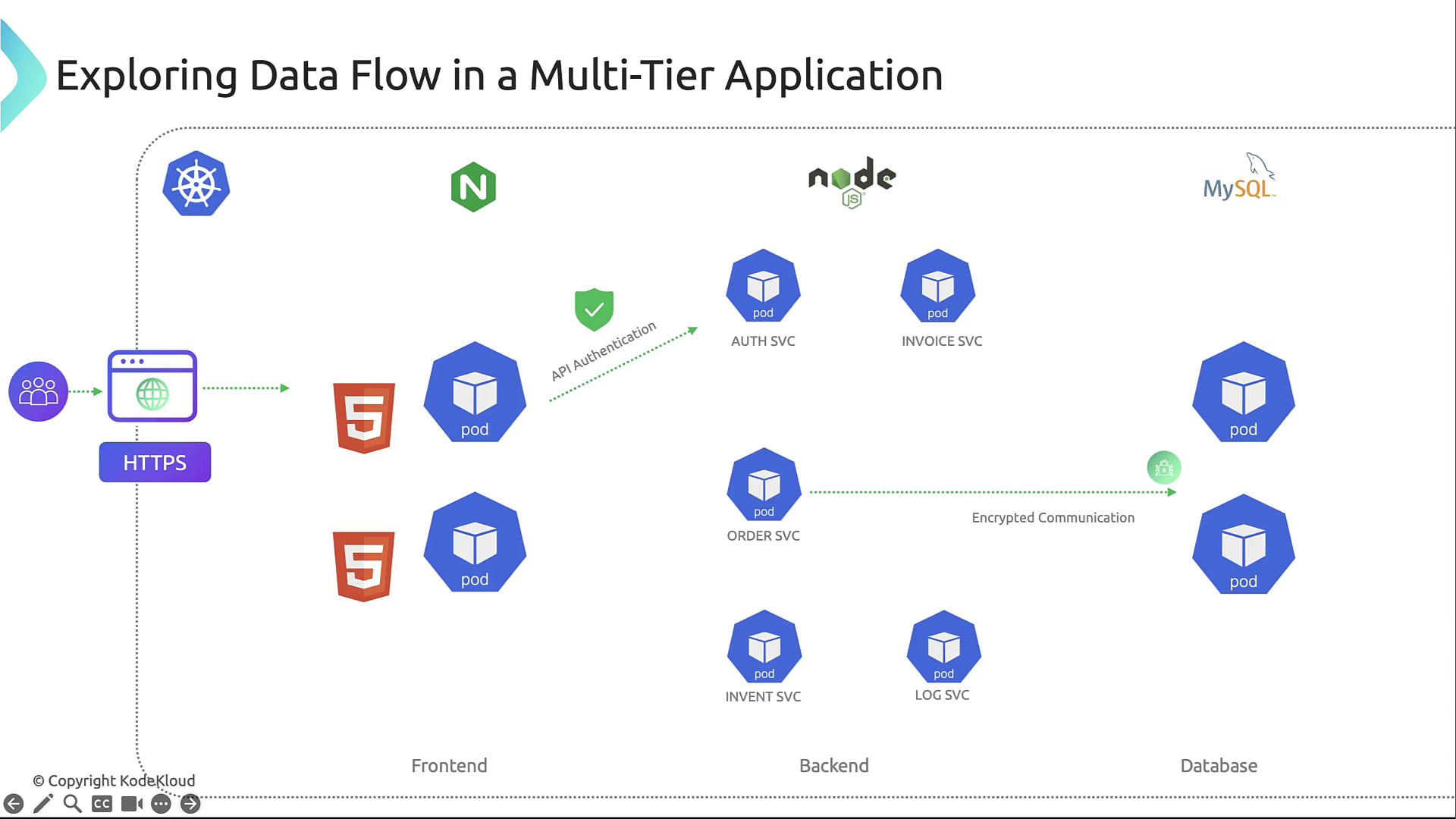 Node.js pods implement RESTful endpoints, perform request validation, and interact with the database using least-privilege credentials.