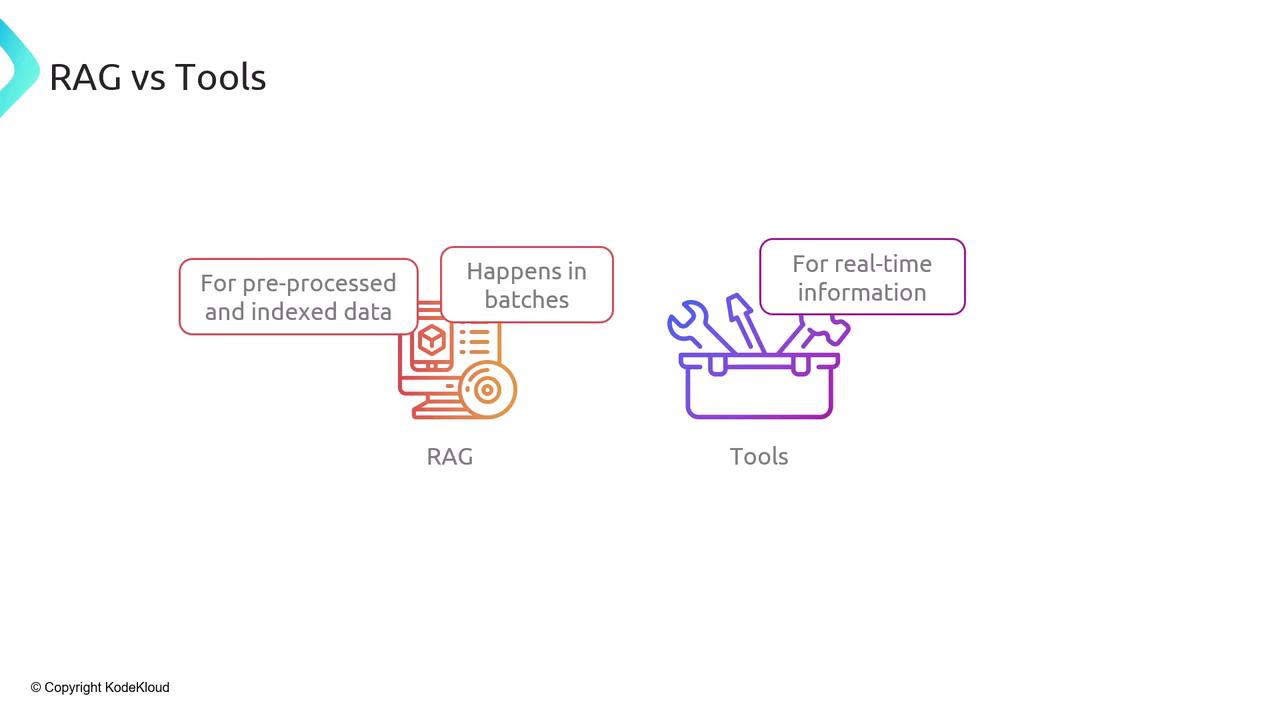 | Capability | RAG (Pre-Indexed) | Tools (Real-Time) |