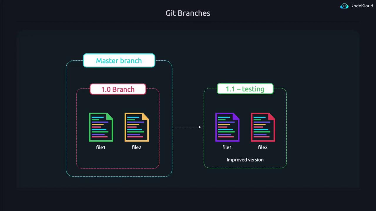 Imagine your master branch is currently at version 1.0 with file1 and file2. The diagram below illustrates this concept by presenting the "Master branch" as the stable codebase accessed by users.