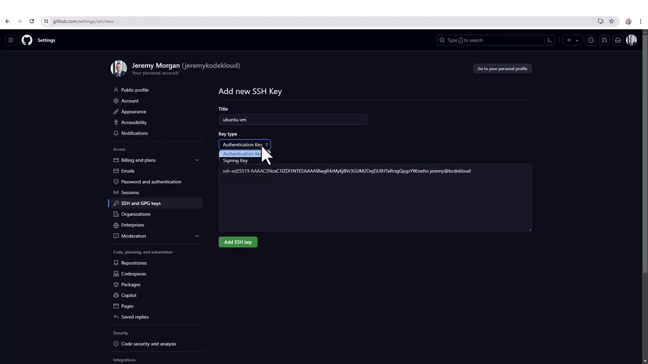 Copy the displayed key and add it to your GitHub account under Settings → SSH and GPG keys.