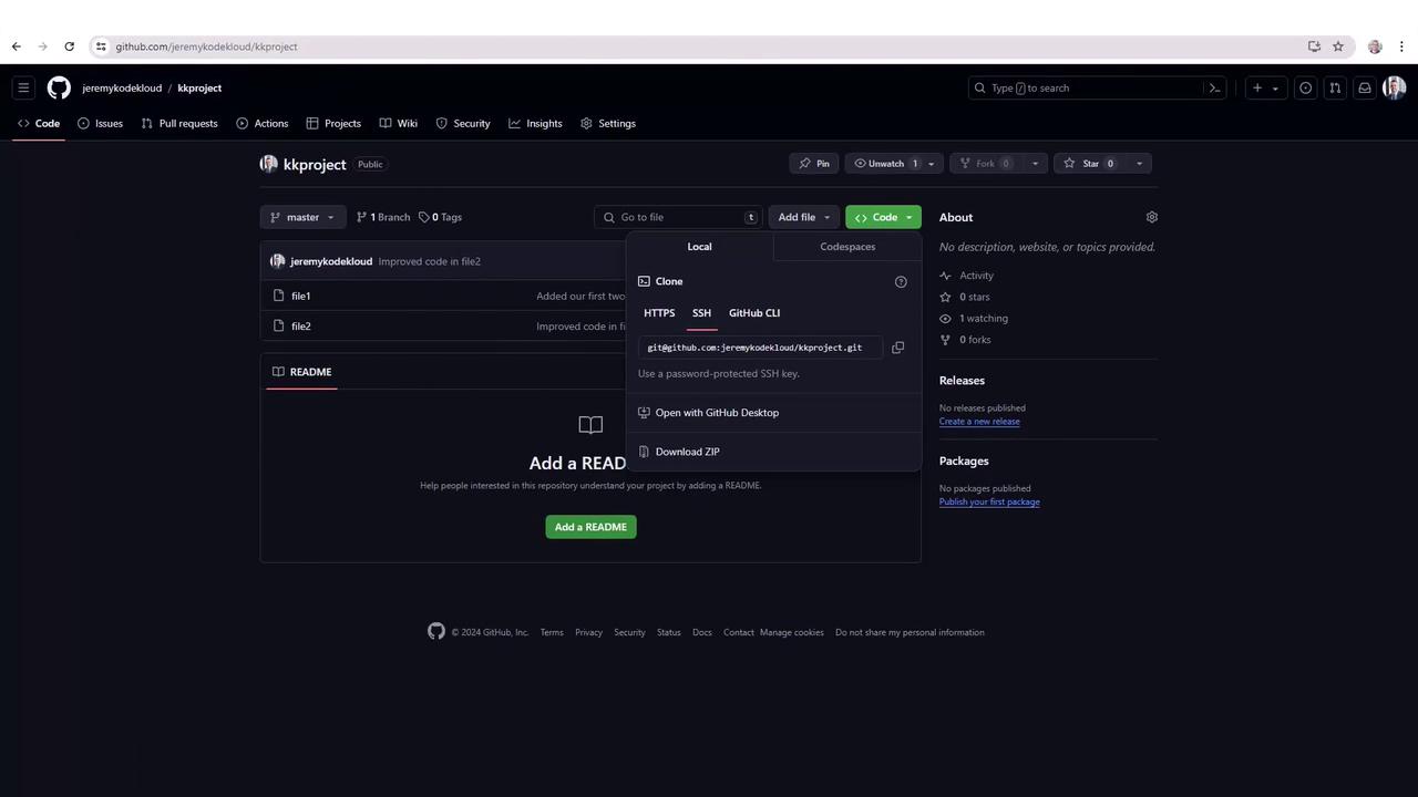 git clone [email protected]:jeremykodekloud/kkproject.git