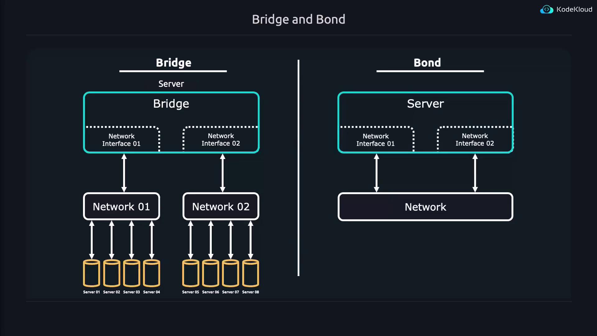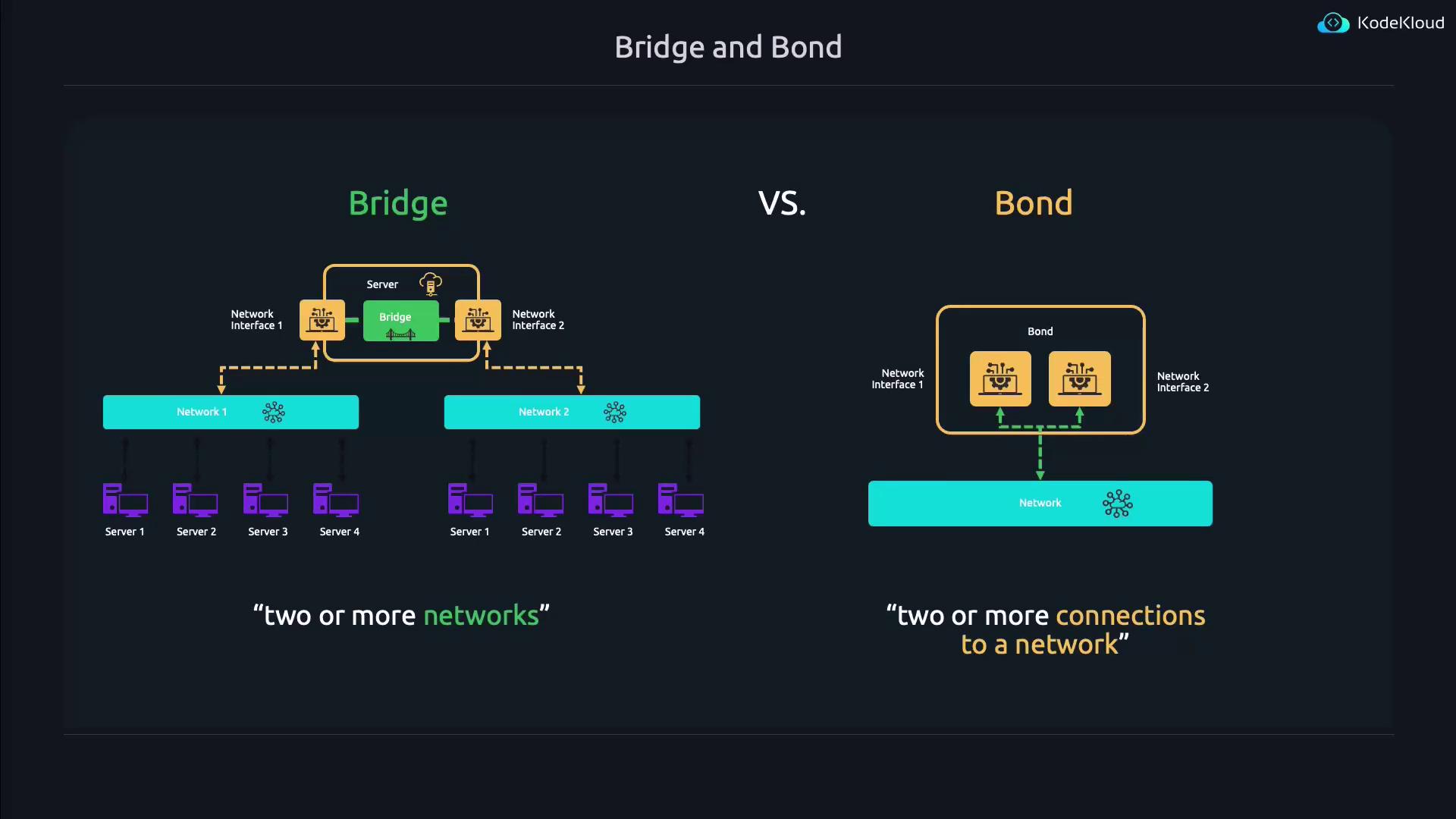 In this lesson, we explore two essential networking techniques: bridging and bonding. Both approaches allow multiple network devices to be combined into a single virtual device managed by the operating system, yet they serve distinct purposes for network connectivity and performance.