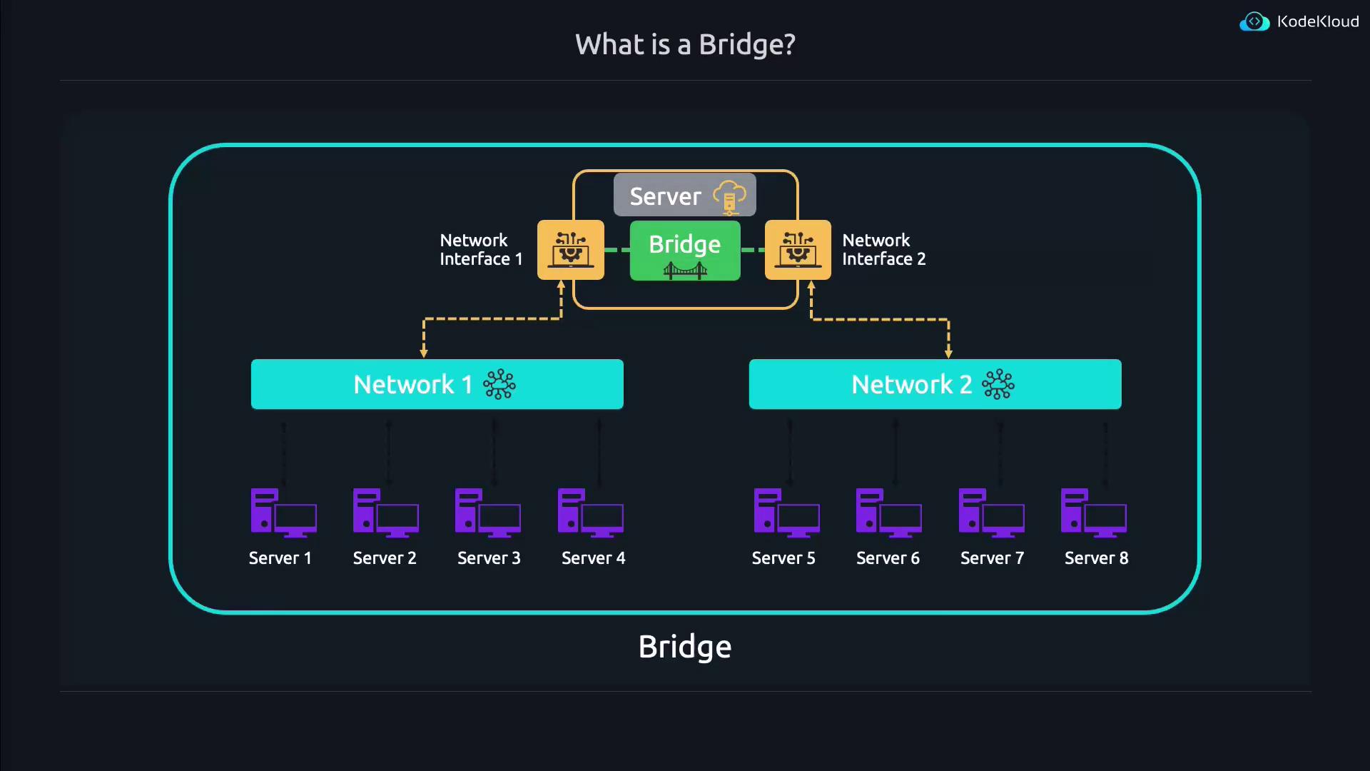 Consider a server with two network interfaces (or network cards) connected via cables to different networks. By adding these interfaces to a bridge, devices on either network can interact without additional routing. In Linux, this virtual device is simply called a bridge, and each network interface attached to the bridge is known as a port.