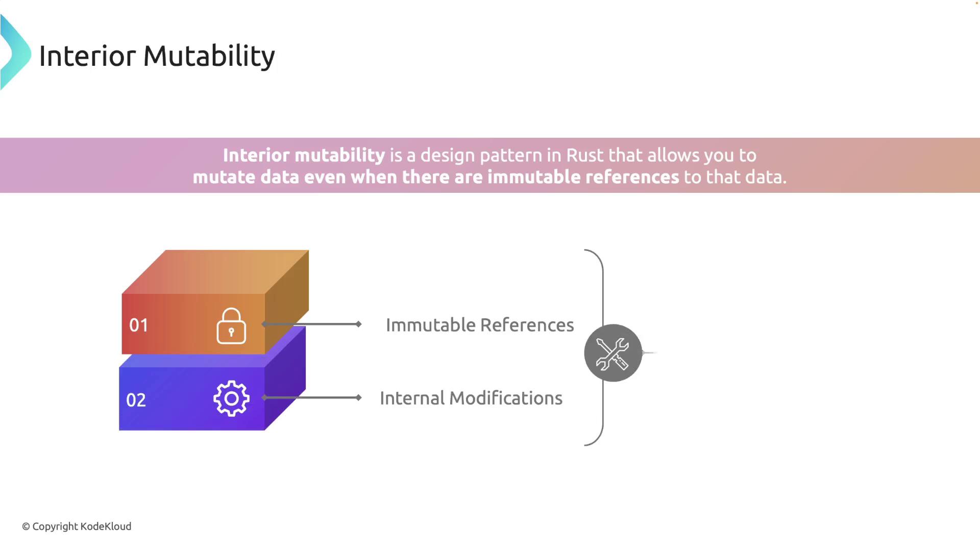 Rust strictly enforces borrowing rules to prevent data races and ensure safety. Typically, a variable can either have multiple immutable references or one mutable reference at a time. However, situations arise where modifying data is necessary even when only immutable references are available. This technique, known as interior mutability, enables you to achieve that flexibility. The RefCell<T> type is widely used for this purpose as it dynamically enforces borrowing rules at runtime instead of compile time.