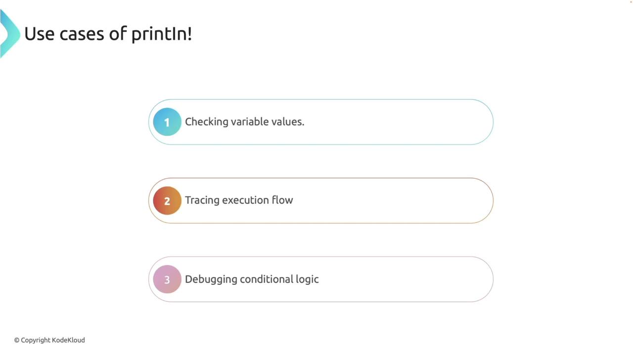The println! macro is a straightforward way to print text and variable values to the console, making it ideal for quick and simple debugging tasks. By inserting println! statements in your code, you can trace execution, verify variable contents, and troubleshoot conditional logic.