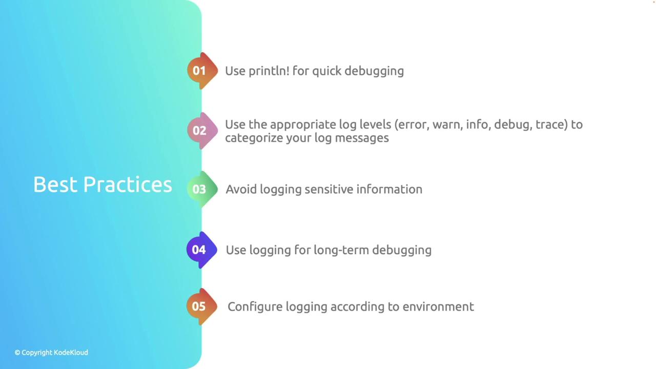 | Use println! for Quick Debugging | Ideal for small tests; avoid overusing it in larger, production-grade applications. |