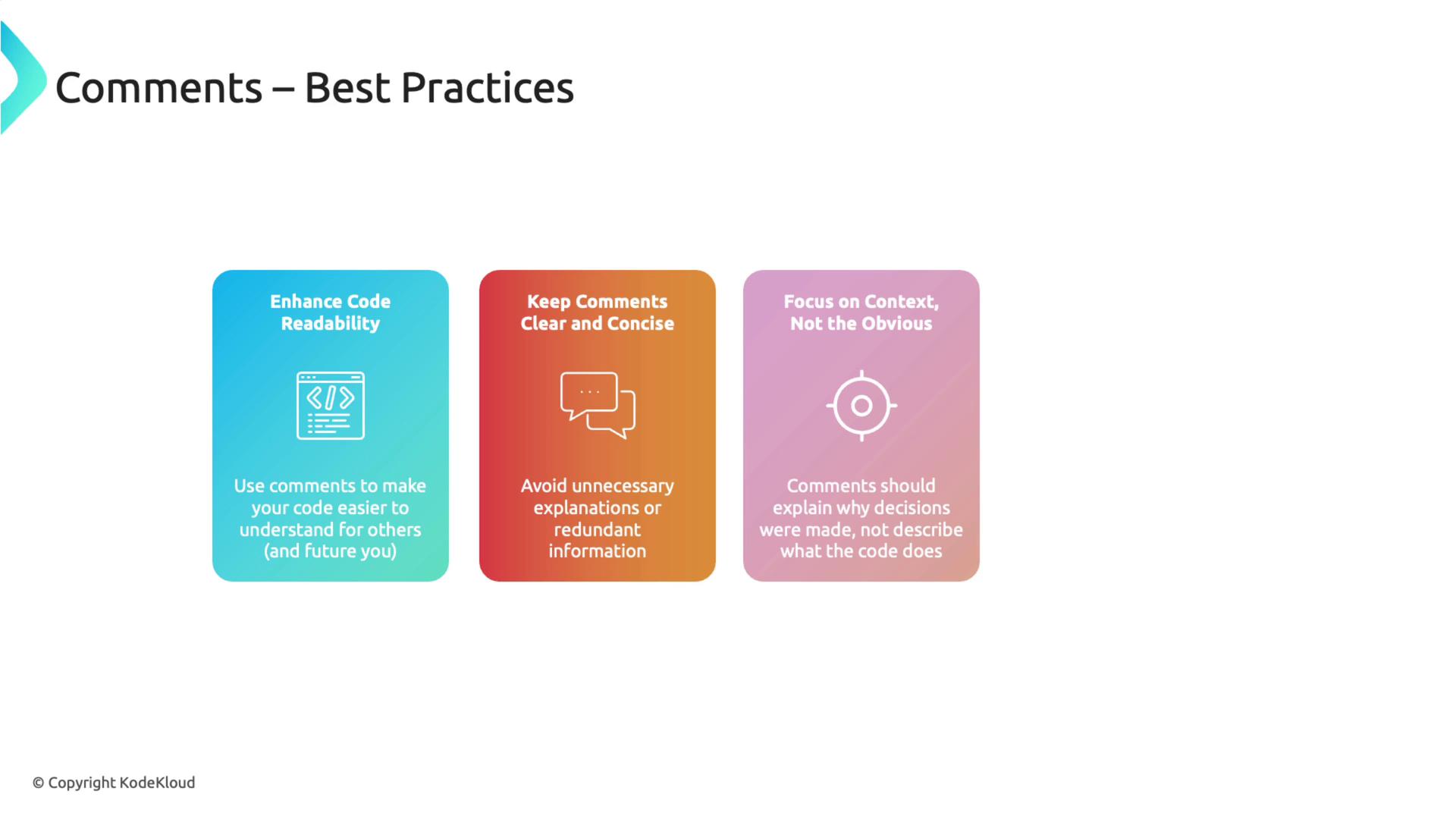 Use comments judiciously to highlight important insights, keeping your code maintainable and accessible for both current and future developers.