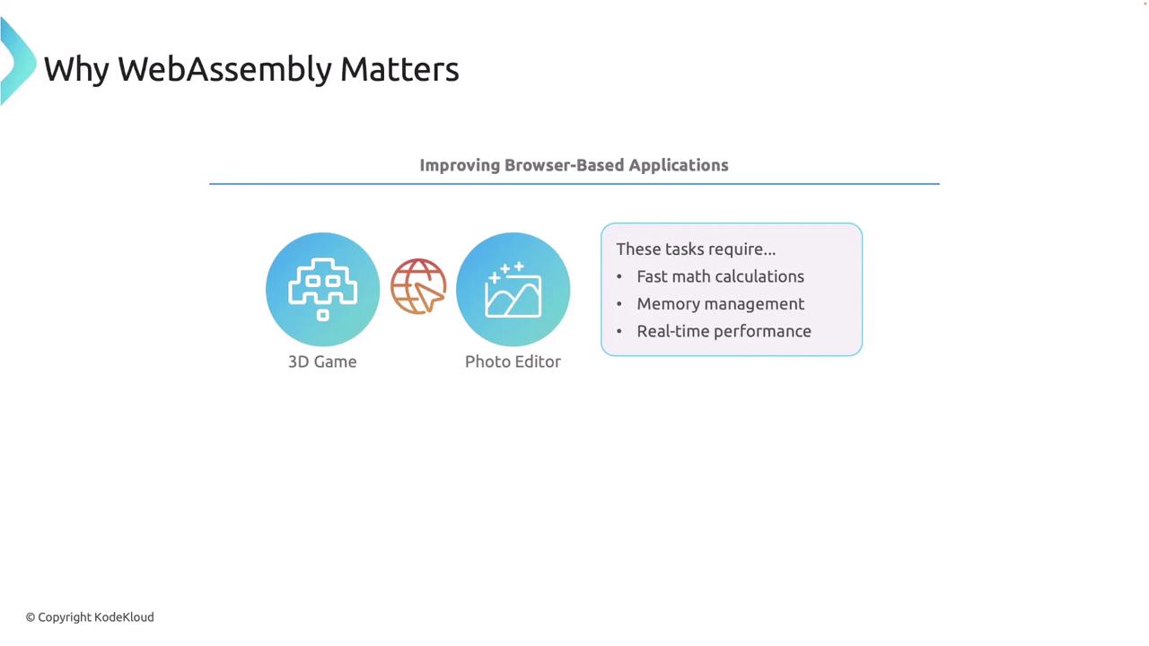 WebAssembly comes into play when browser applications require enhanced performance for tasks like 3D gaming, photo editing, and other computation-heavy processes. By using high-performance languages for critical sections and JavaScript for UI and general logic, developers can achieve significant performance improvements.