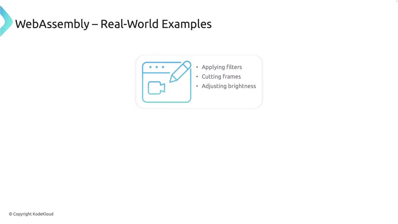Imagine editing a high-definition video in your browser—applying filters, cutting frames, or adjusting brightness in real time. WebAssembly makes it possible to handle these resource-intensive tasks efficiently, providing a more responsive user experience.