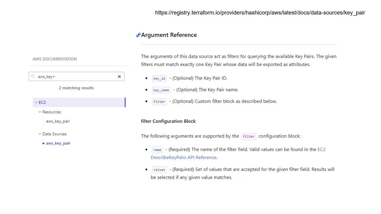 Terraform’s documentation offers detailed explanations on accepted arguments and the exported attributes for each data source. While this example relies on the key name "alpha" to identify the key pair, alternative identifiers such as key ID or specific filters can also be used. For example, if the key pair includes a tag with the key "project" and the value "Cerberus", you can apply filters to locate the correct resource.