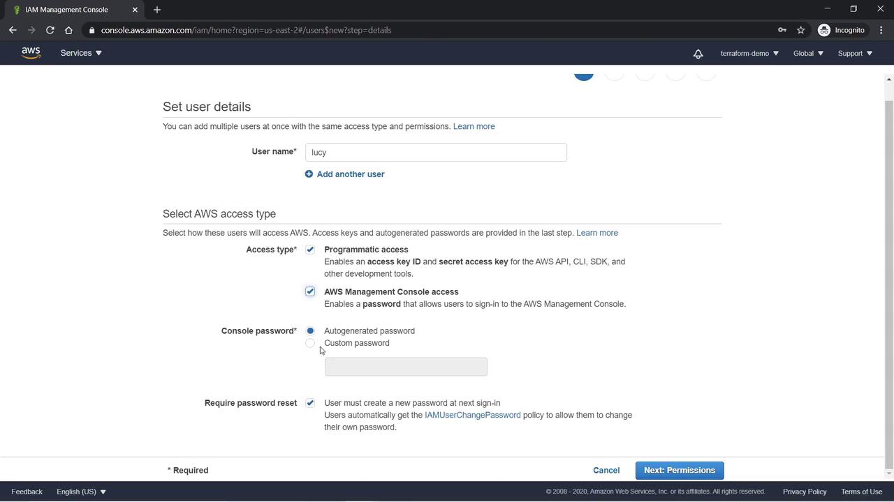 For Lucy, set a custom password and enable the option for her to reset the password upon first login. This automatically attaches an IAM policy that permits password changes.