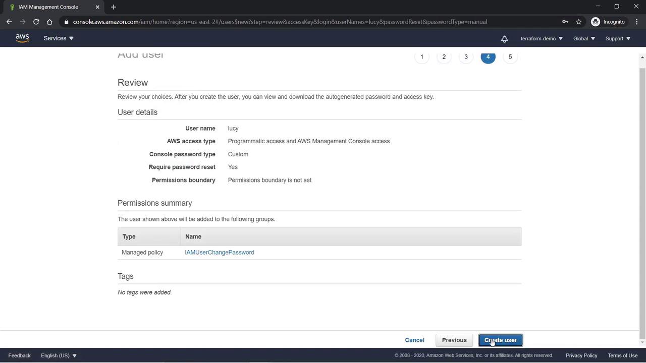 Skip adding tags by clicking Next: Review. Finally, review the details and click Create User.