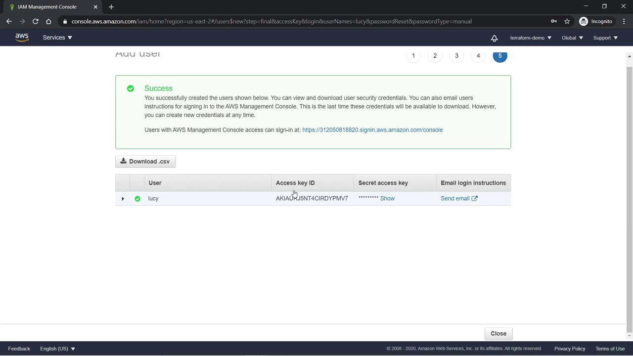 After creating Lucy, you can download her access key and secret access key as a CSV file. Remember, this is the only time the secret access key is visible; if lost, new credentials must be generated.