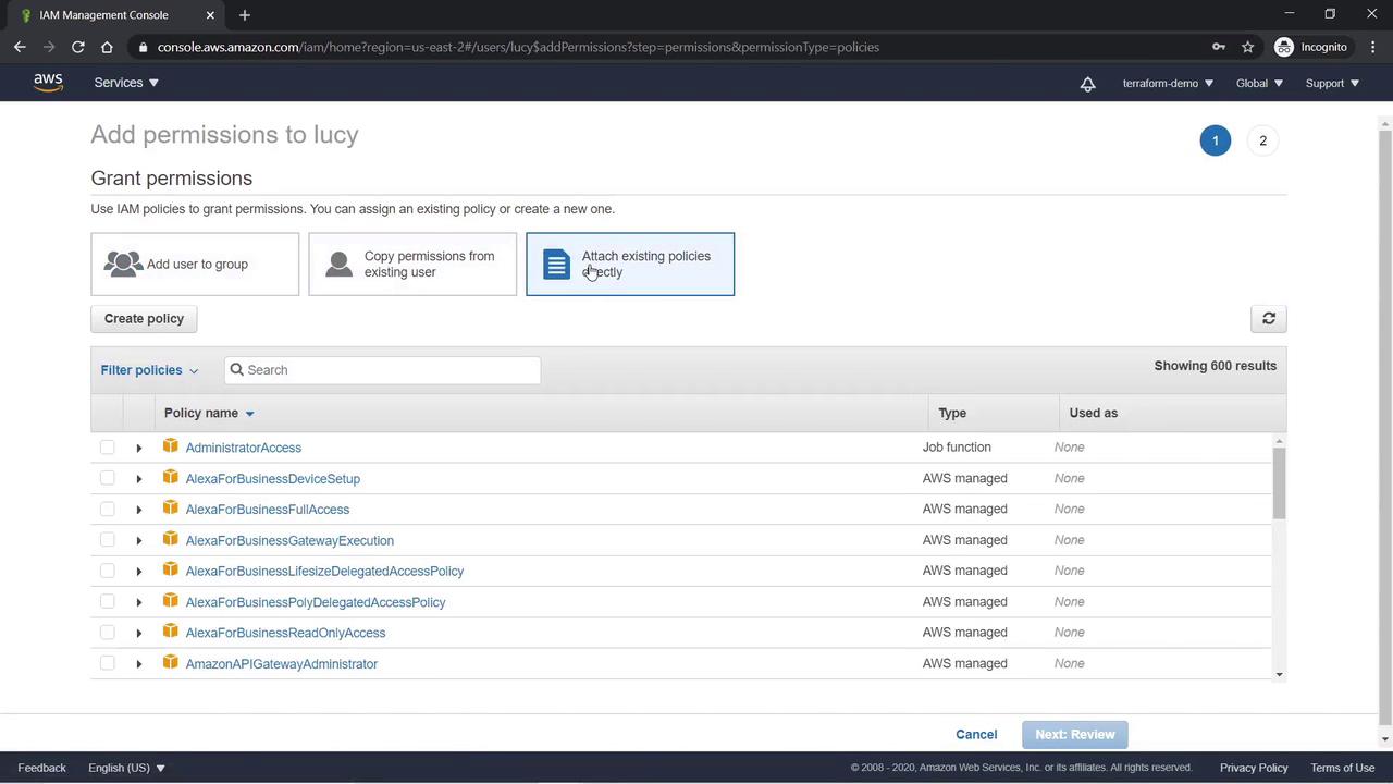Select the AdministratorAccess policy, click Next, review the permissions, and then click Add Permissions. Lucy now has both the default password change policy and the administrative policy attached.