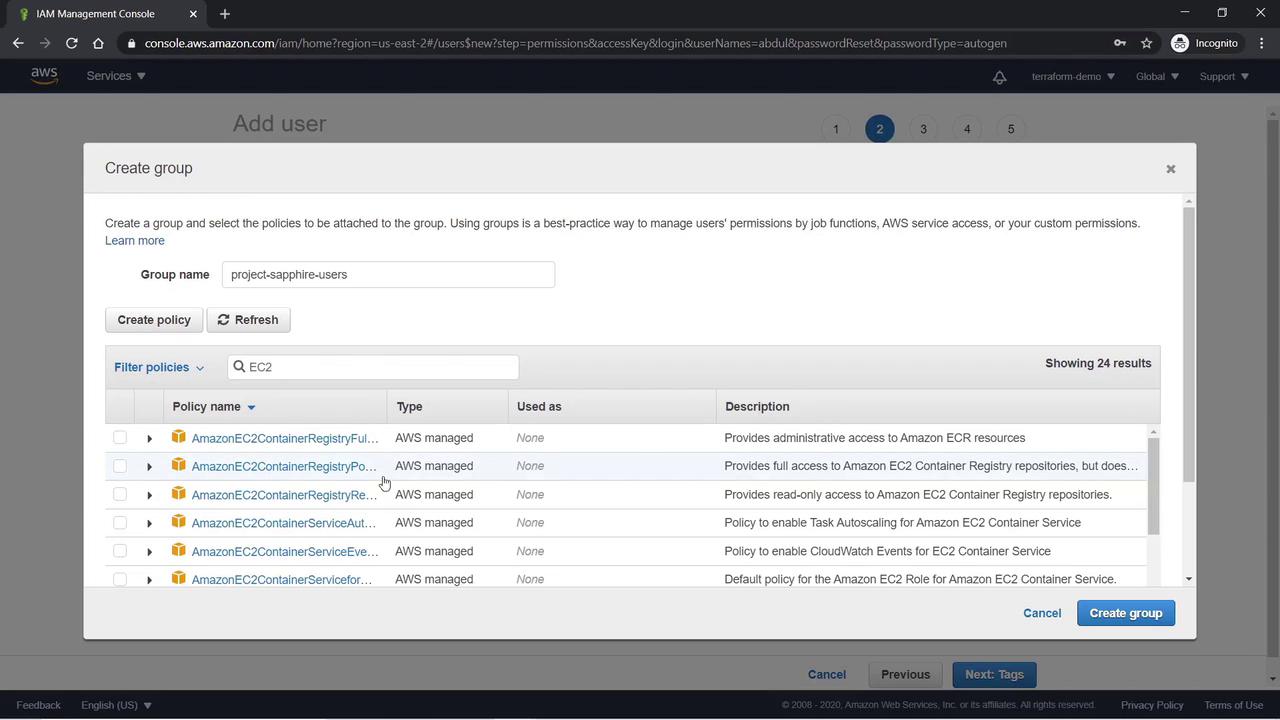Next, we will create another user named Abdul and group him with Lee. For Abdul, follow the same steps used earlier to create a user. When prompted, select to create a new group called "Project Sapphire Users" and attach the AmazonEC2FullAccess Policy.