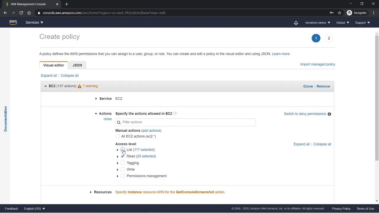 To illustrate policy creation, we will create a custom policy that restricts EC2 actions to read and list operations: