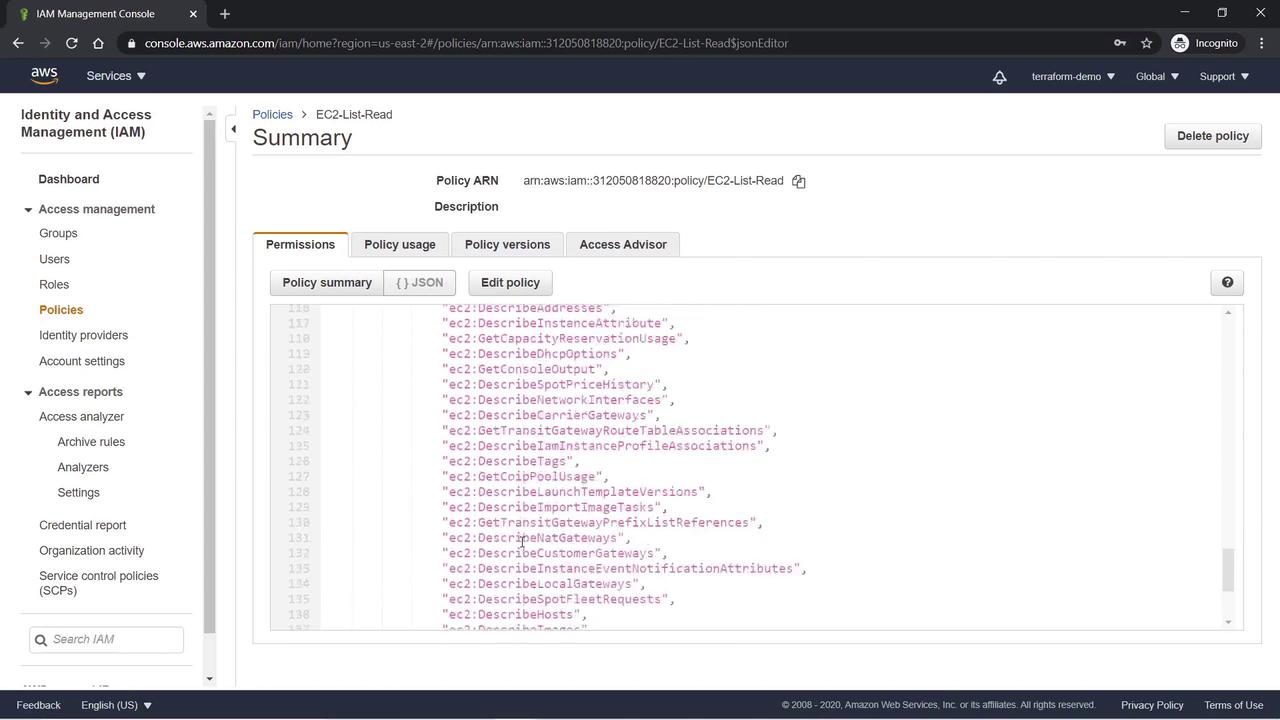 - Click Review and name the policy "EC2-List-Read". Verify the JSON document to confirm it permits list and read actions on all EC2 resources.