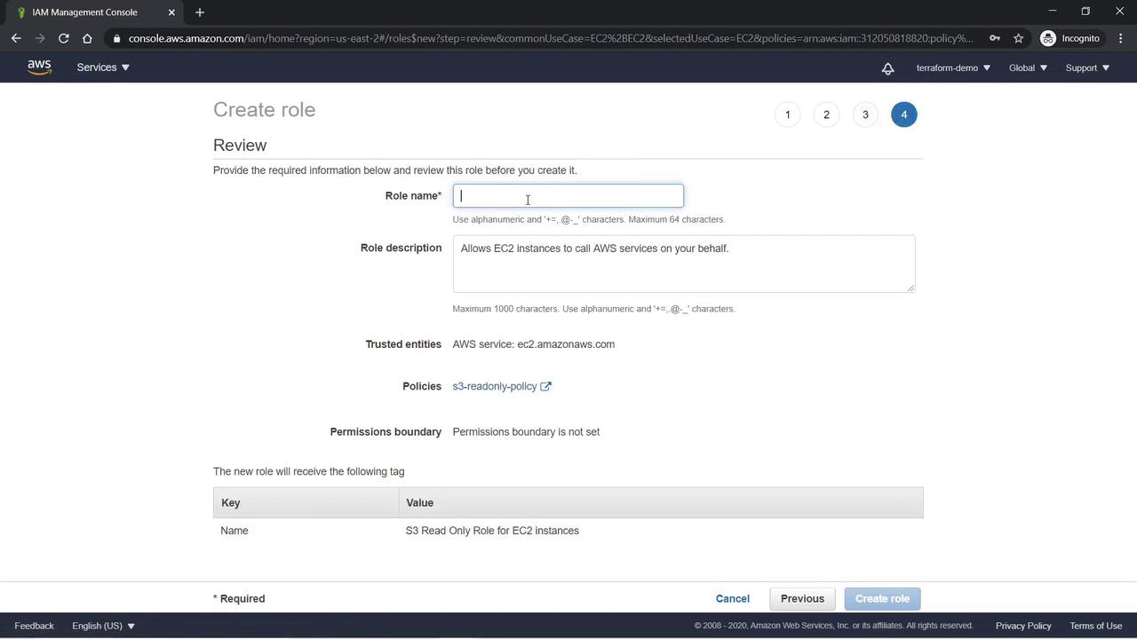 - Optionally, add a tag with the value "S3-Read-Only role for EC2 instances".