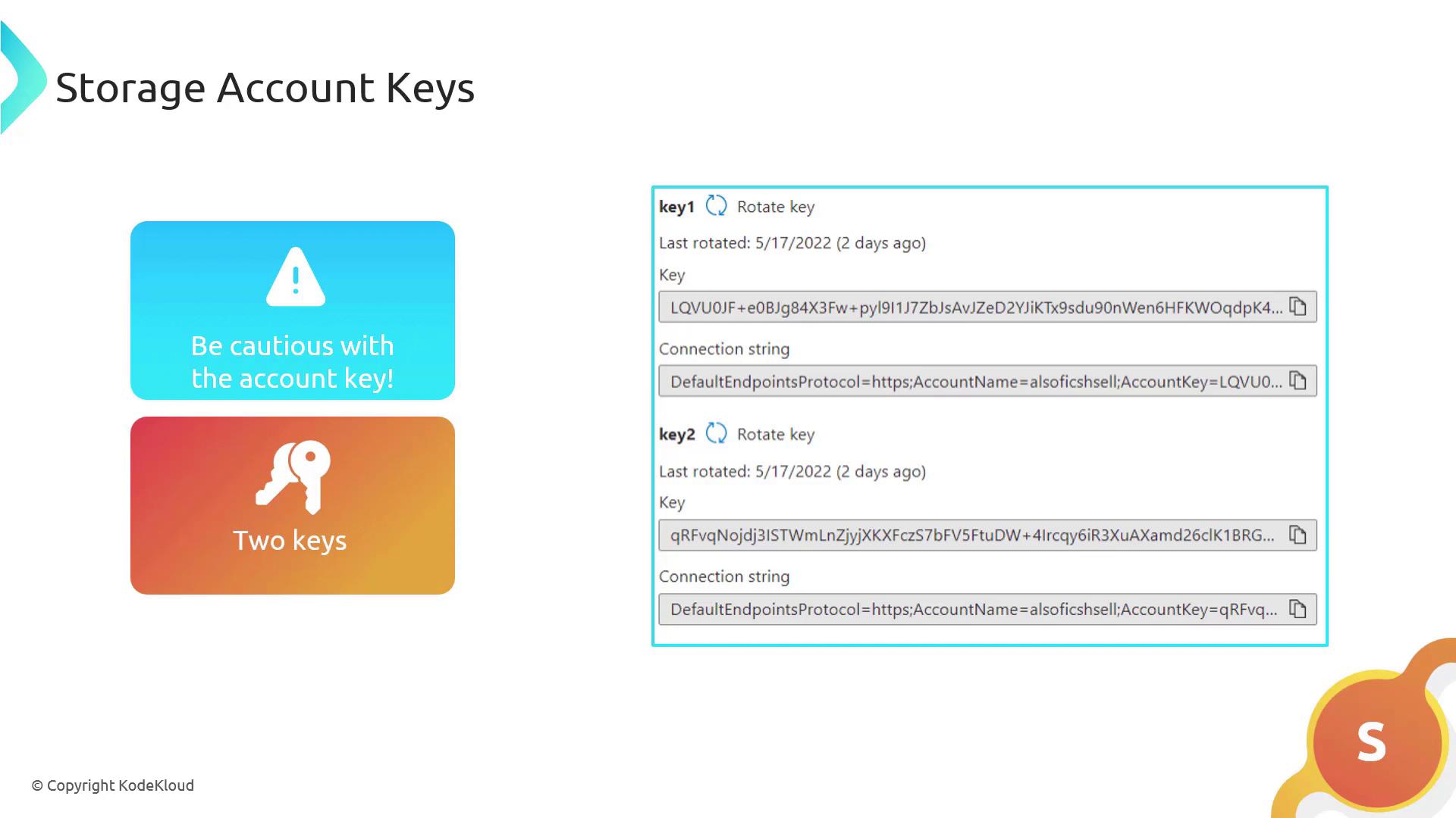 Storage account keys are fundamental to Azure security and access management. They authenticate applications and services that access storage resources such as blobs, queues, tables, and files.