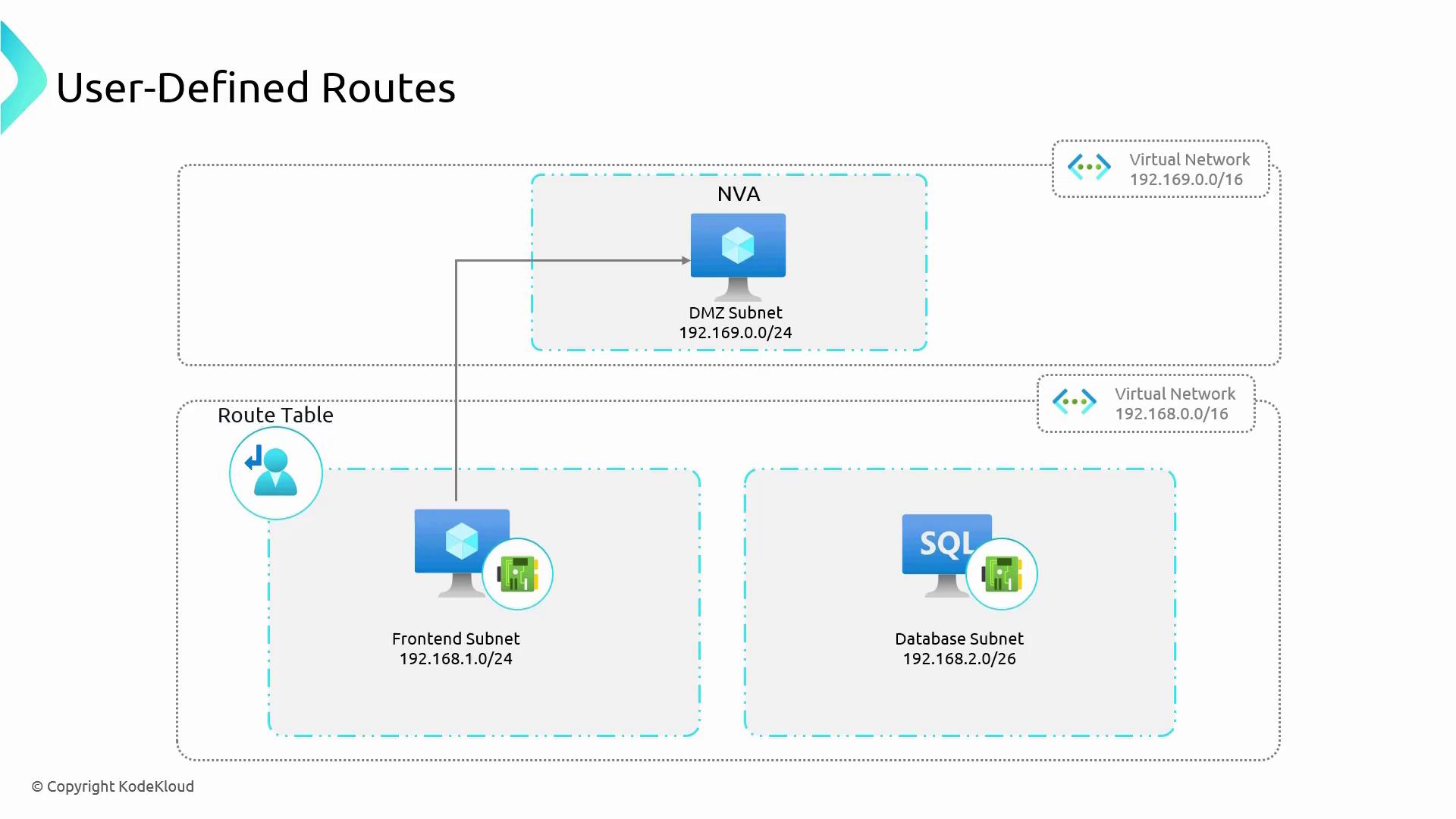 Imagine a scenario where traffic from a frontend subnet must communicate with a database subnet. Normally, system routes would enable direct connectivity between these subnets. However, if your organization’s security policy requires that all traffic from the frontend to the database passes through an NVA (acting as a firewall), then default routing is insufficient.