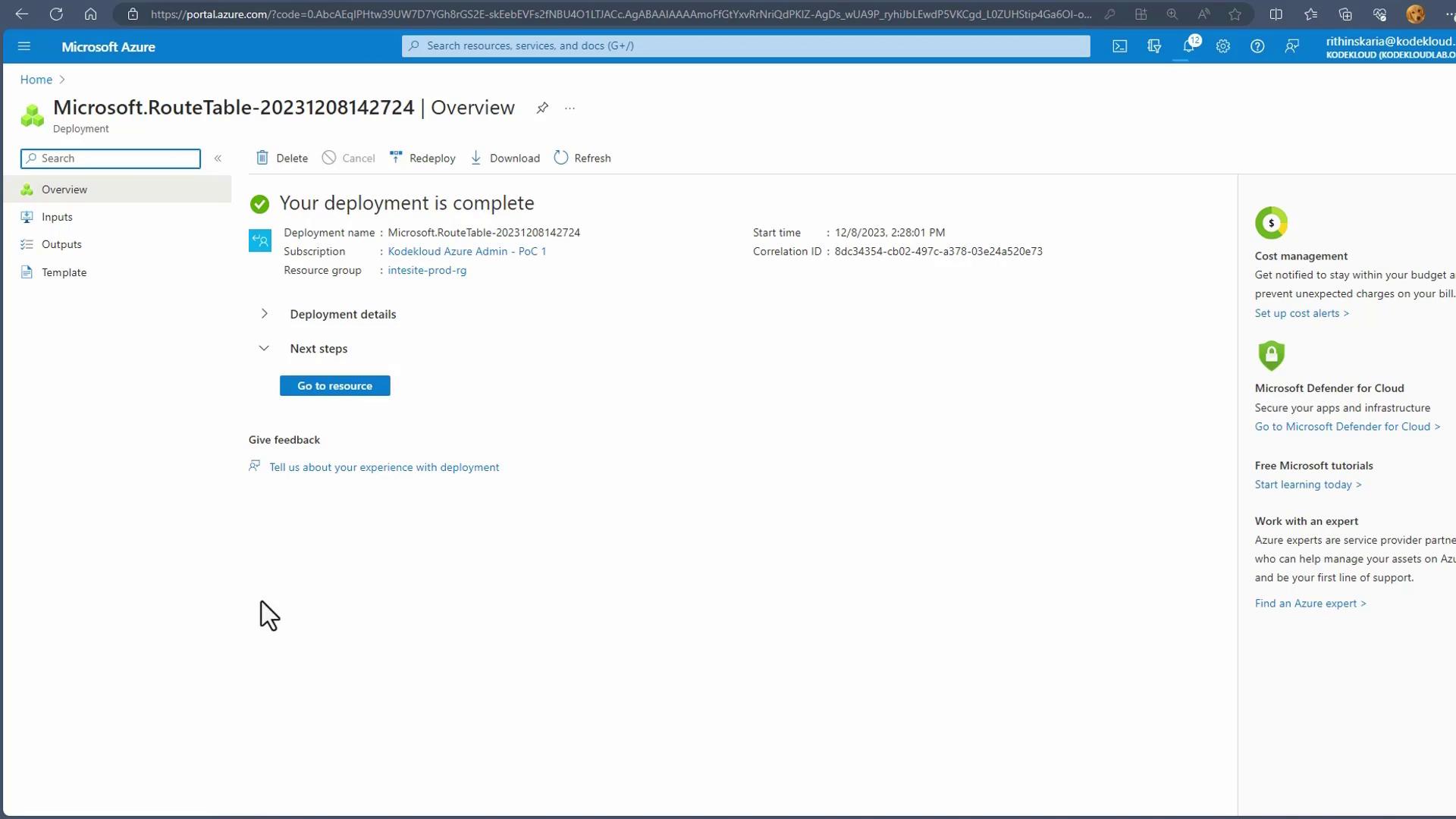 After deployment, review the deployment details to ensure your route table is configured correctly before association.