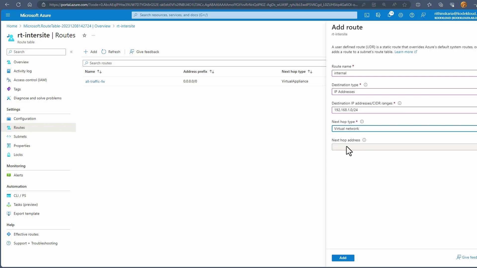- Create a new route table. For example, you could use a resource group named "inter-site" and name your route table "RT-inter-site".