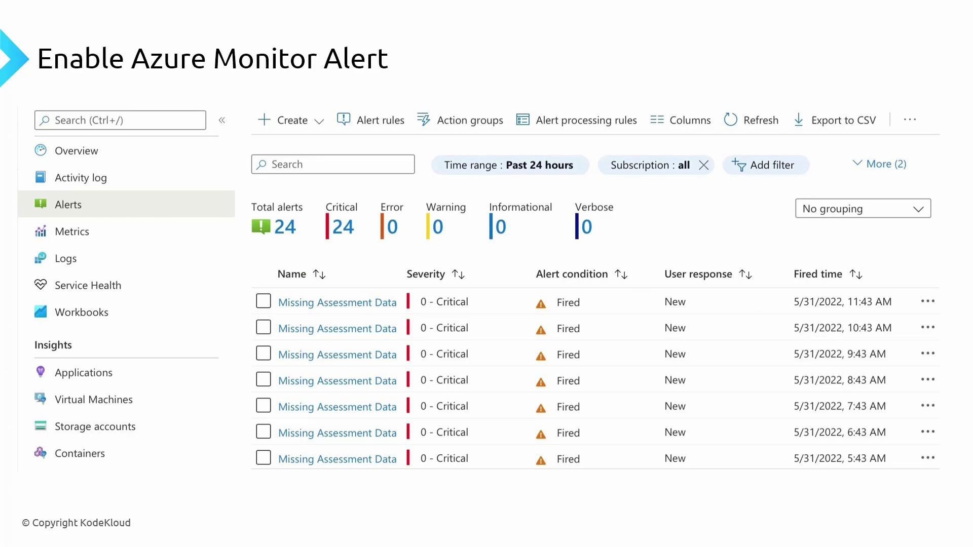 In this lesson, you will learn how to enable and configure Azure Monitor Alerts to stay informed of critical events in your Azure subscription. Azure Monitor Alerts provide a unified experience for creating notifications on various data sources such as activity logs, service health events, Log Analytics queries, and metrics.