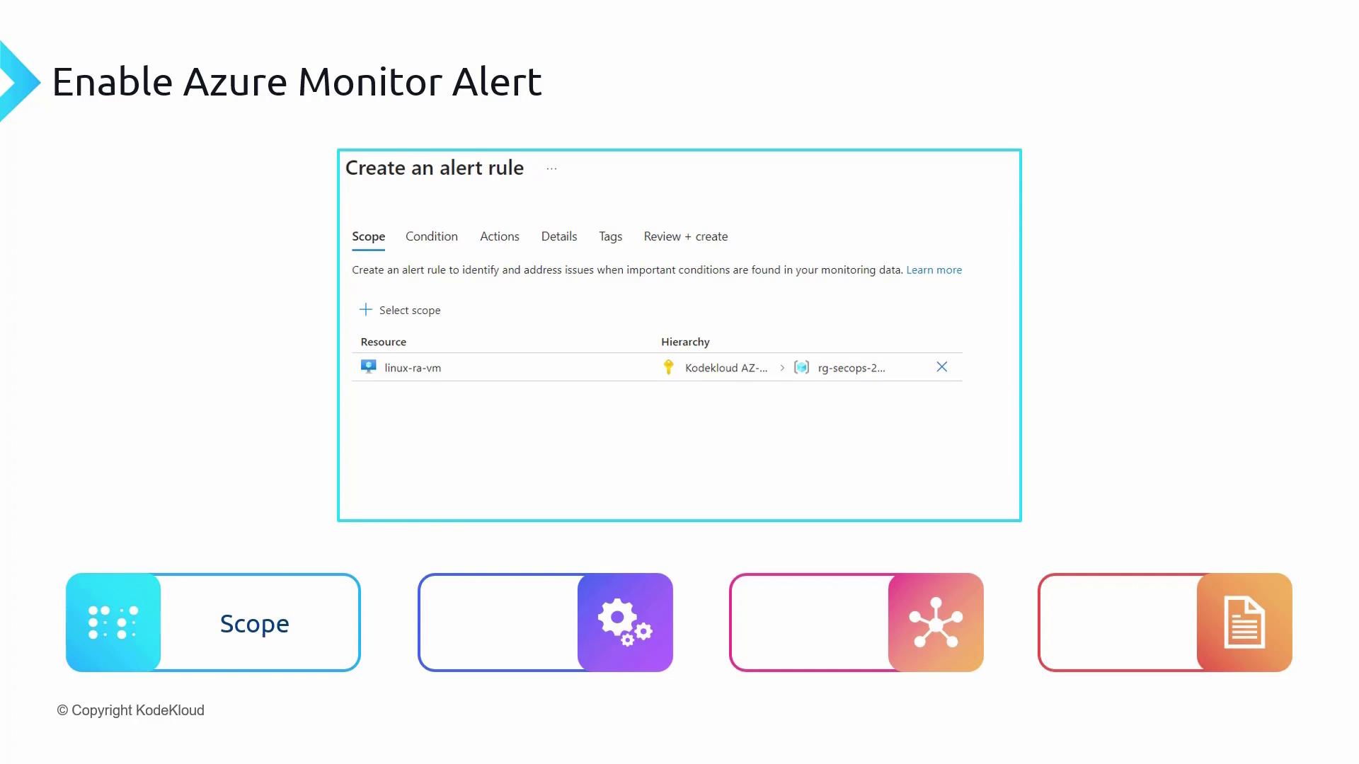 The Scope defines the resources that the alert will monitor. Similar to Azure RBAC or Azure Policy, you can include one or more resources in your alert. This flexibility is particularly useful when creating alerts for activity logs or log query results.