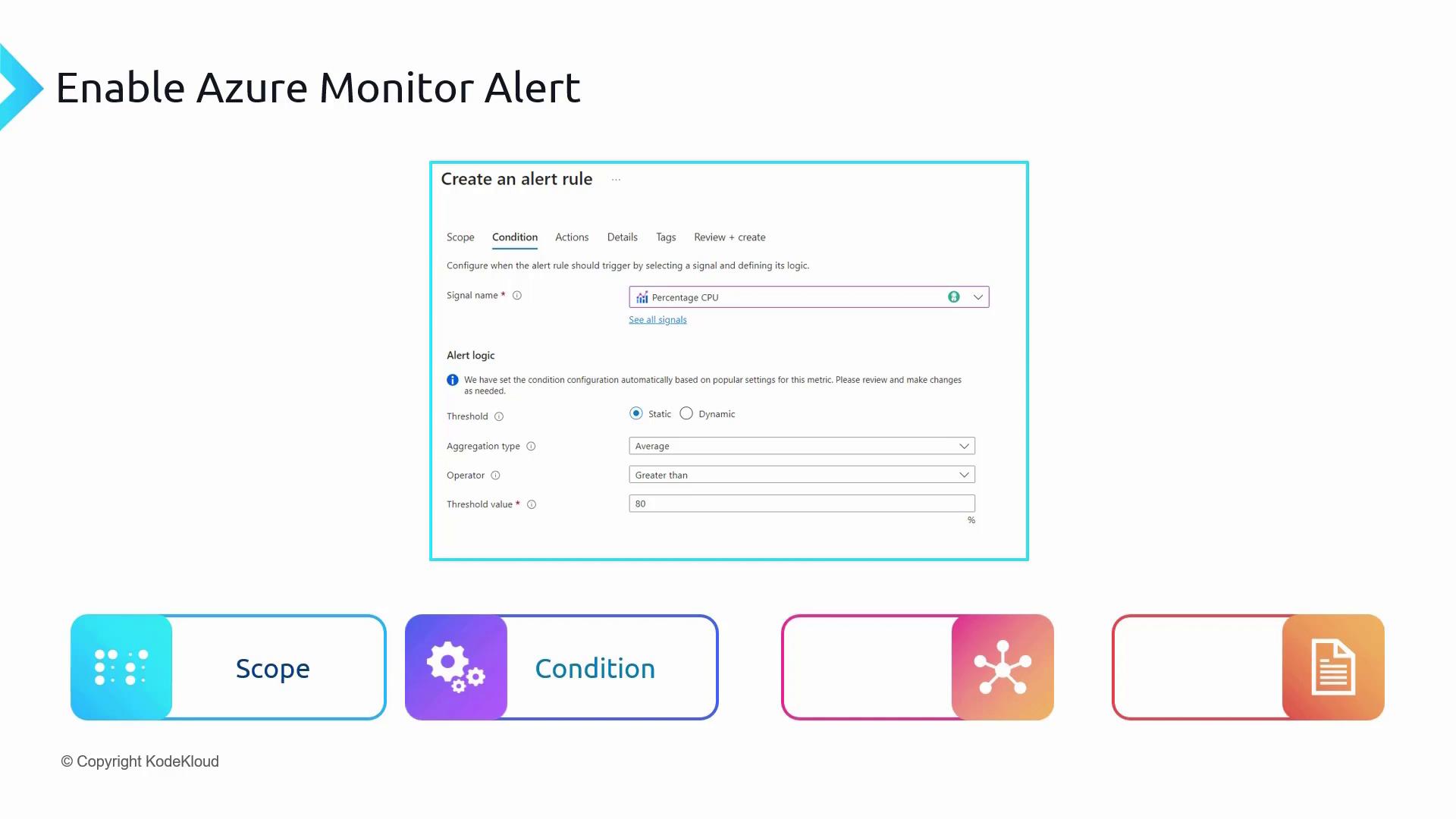 In the Condition step, you define the signal and the criteria that will trigger the alert. For example, you can set up a condition where an alert is fired if the percentage CPU utilization exceeds 80%.