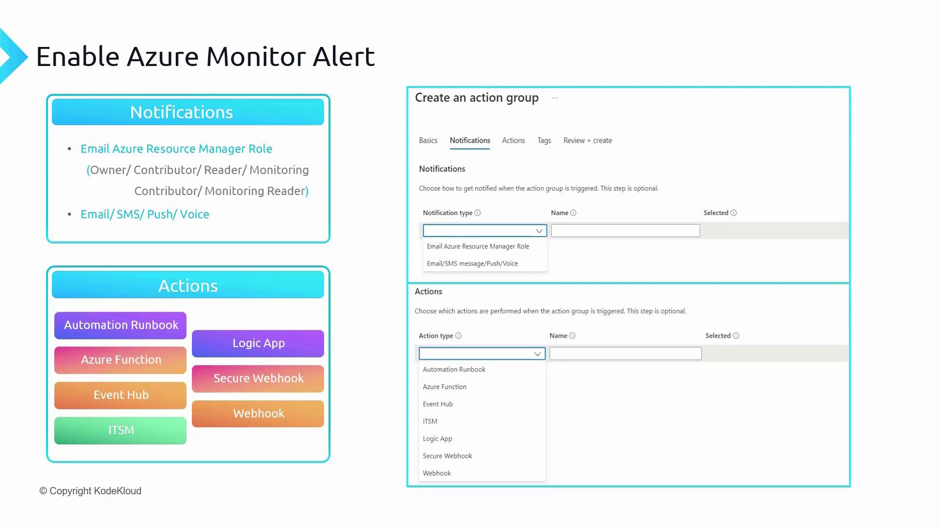 The Action stage involves selecting the action group that determines what happens when an alert fires. Action groups let you configure various notification options (such as email, SMS, push notifications, or voice calls) and automation options (including Automation Runbook, Azure Function, ITSM connectors, etc.). You can even set up multiple action groups for a single alert rule.