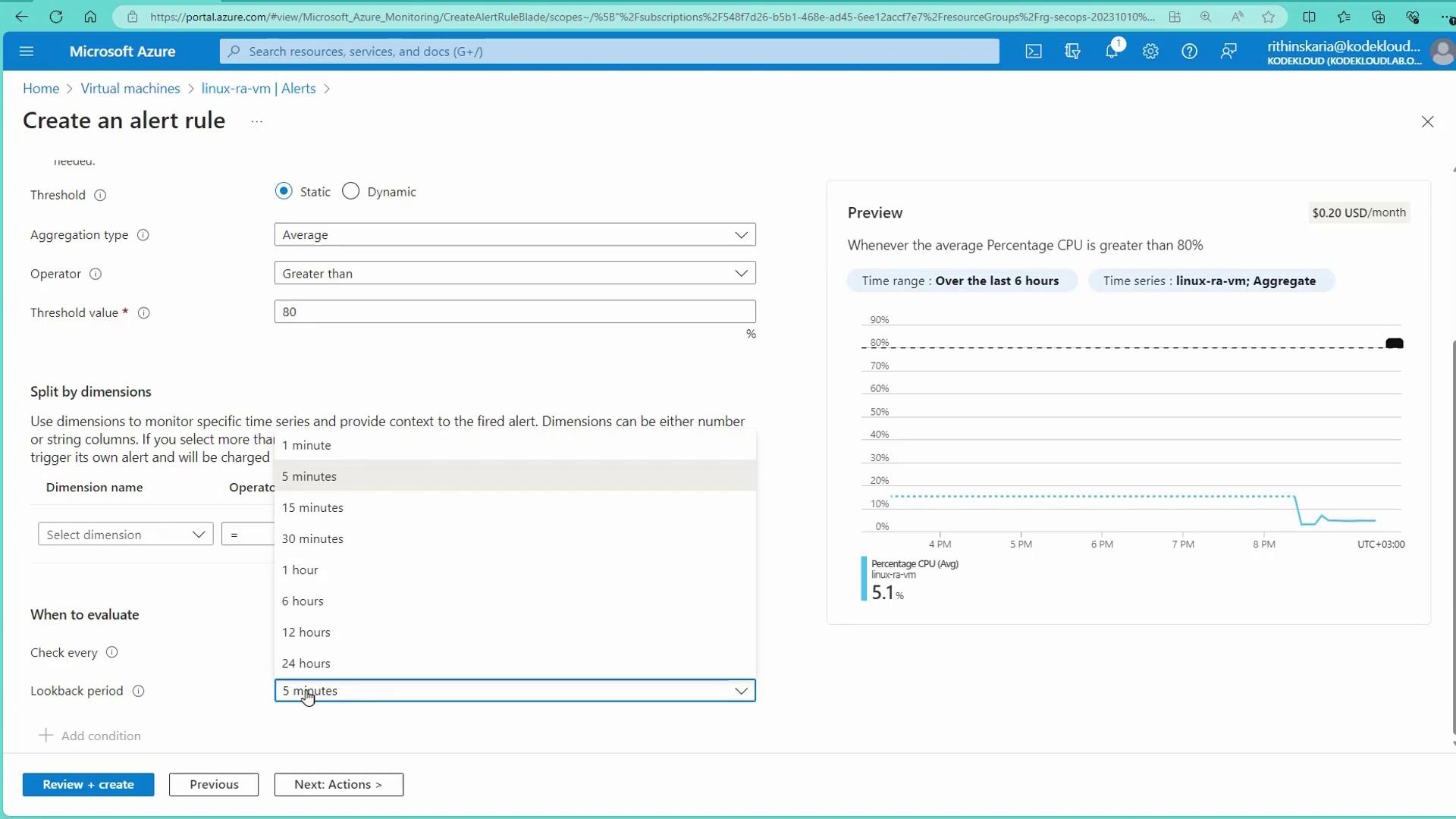 Under Condition, choose the appropriate metric, for instance, Percentage CPU. You can opt for static thresholds or dynamic ones—the latter adjusts to usage patterns to minimize false positives. For demonstration purposes, set a static threshold where the average CPU utilization over five minutes exceeds 80%.