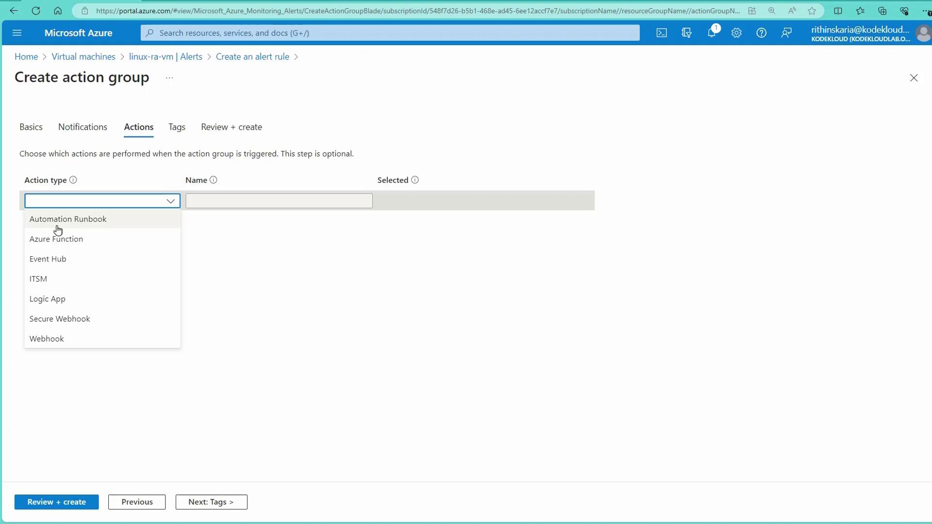 Under Action, either select an existing action group or create a new one (e.g., "VM notification"). This group should define how you want to be notified (email, SMS, push, voice) and any associated automation actions.