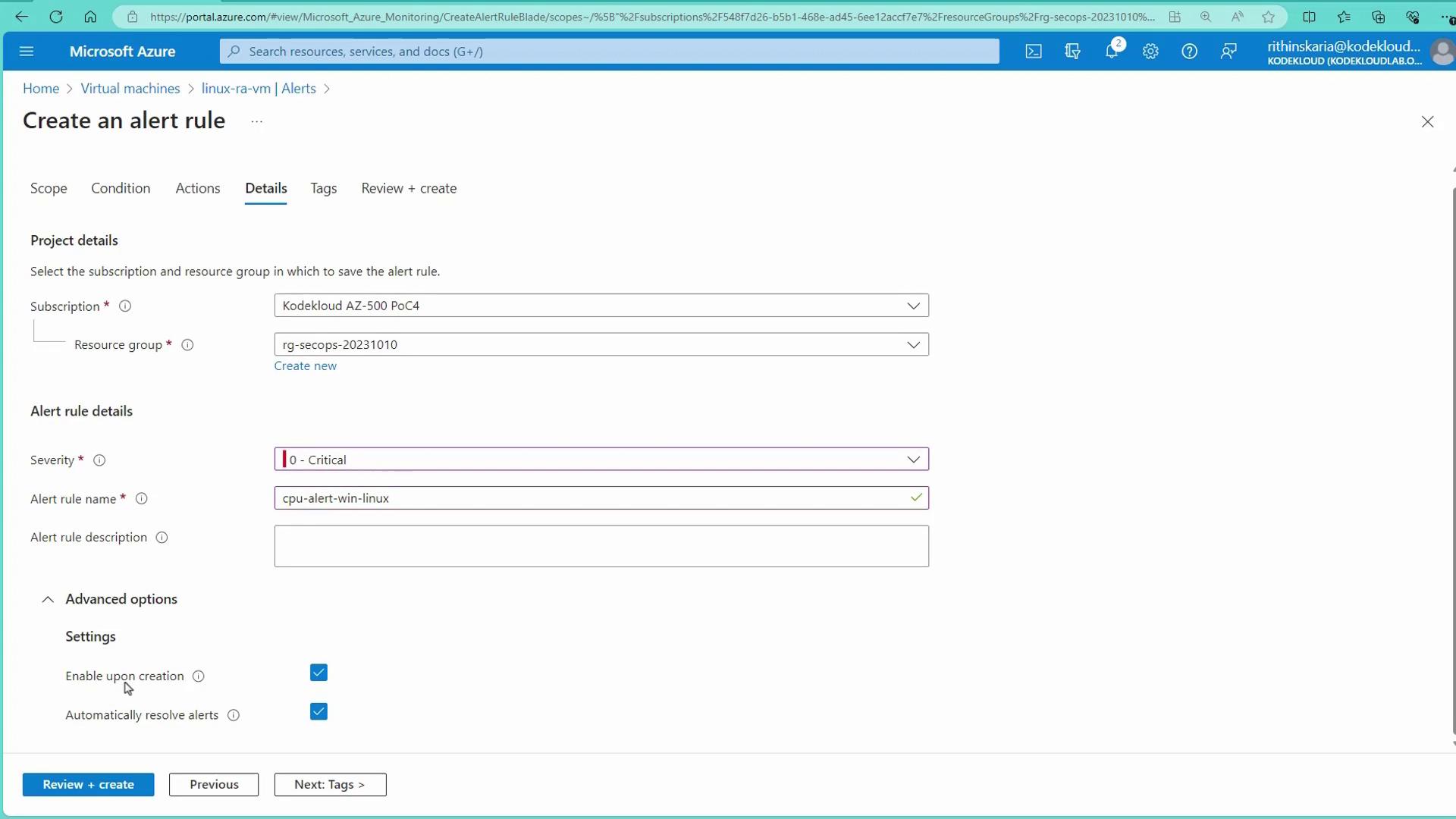 In the Rule Details section, provide a relevant name (for example, "CPU Alert Metrics - Linux"), choose the severity level (e.g., Critical), and configure any advanced settings like immediate rule enabling.