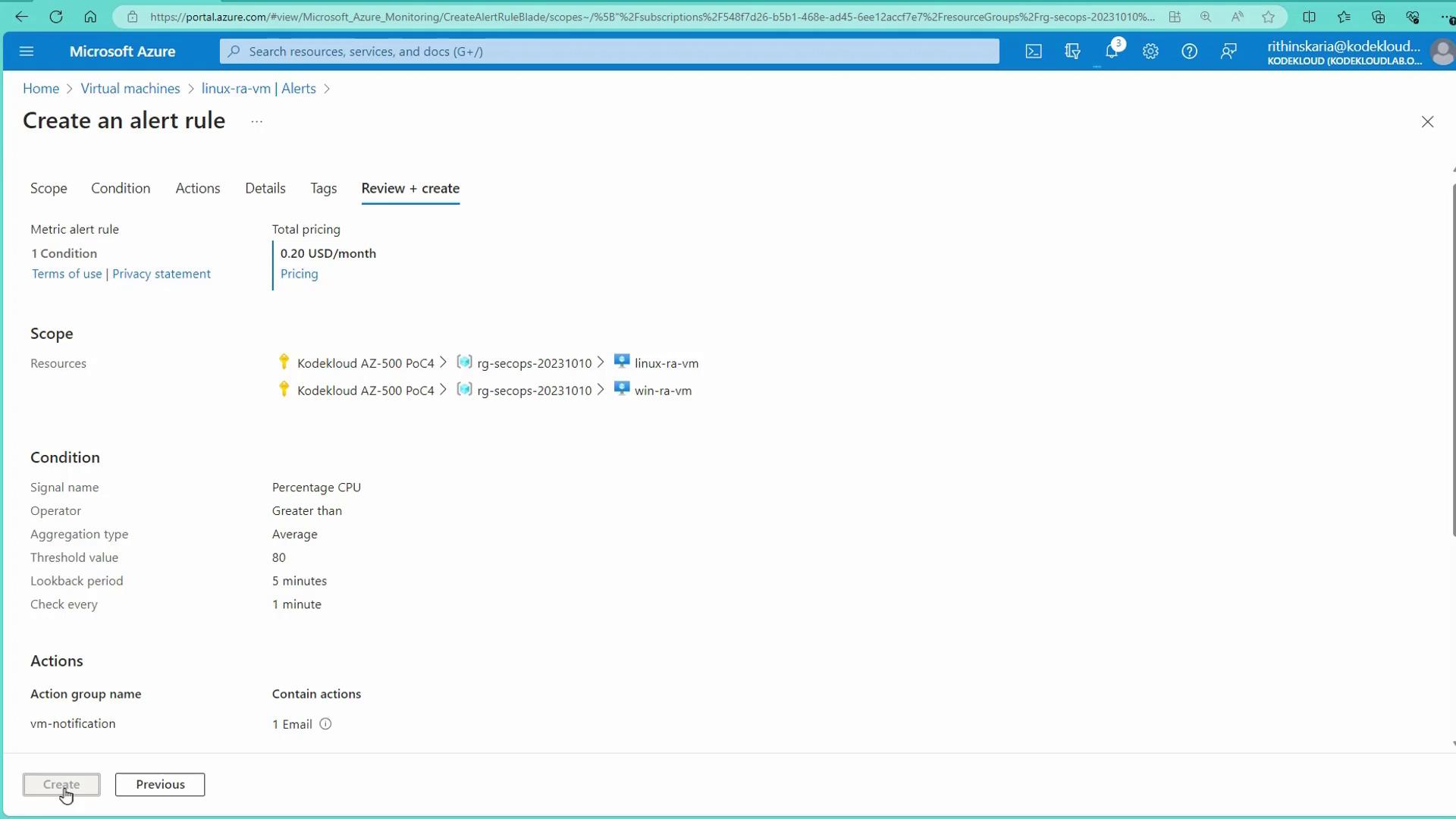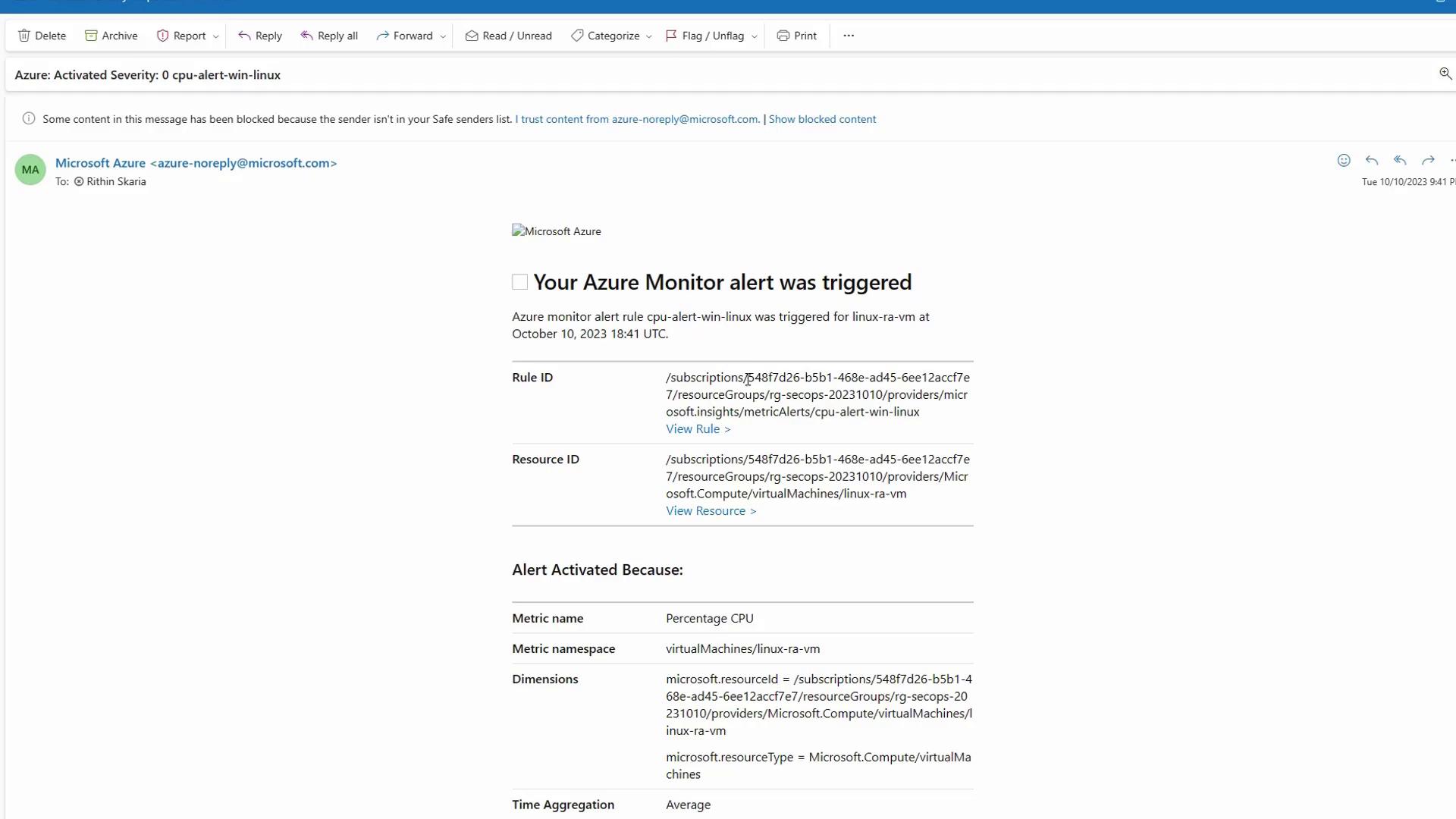 As the CPU utilization surpasses the set threshold (e.g., the average over the last five minutes exceeds 80%), Azure Monitor will trigger the alert and send an email notification.