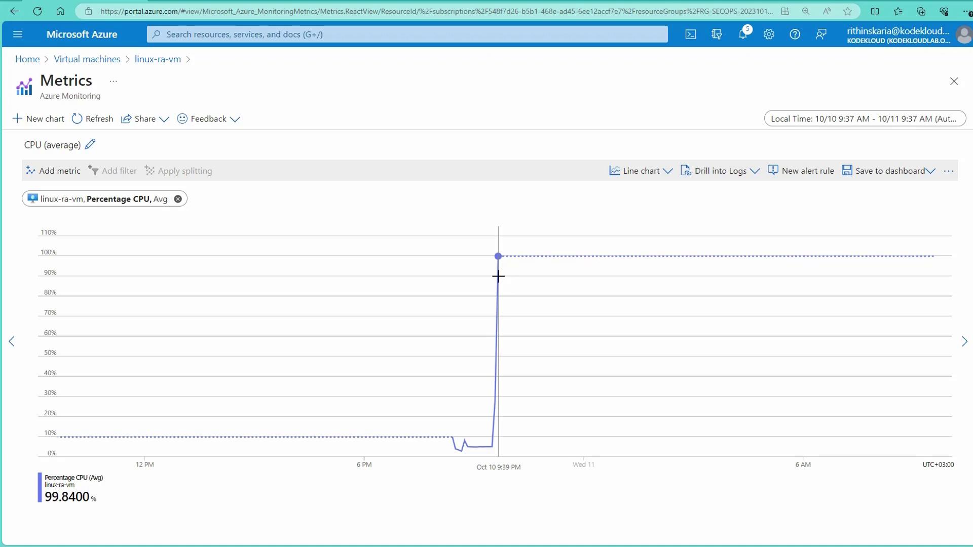 Open another terminal session and SSH into the same VM to run the stress command. For example, to stress 4 CPU cores for 1000 seconds, use:stress -c 4 -t 1000This command forces CPU usage to reach 100%. Monitor the CPU utilization dashboard in the Azure Portal to observe the increase.