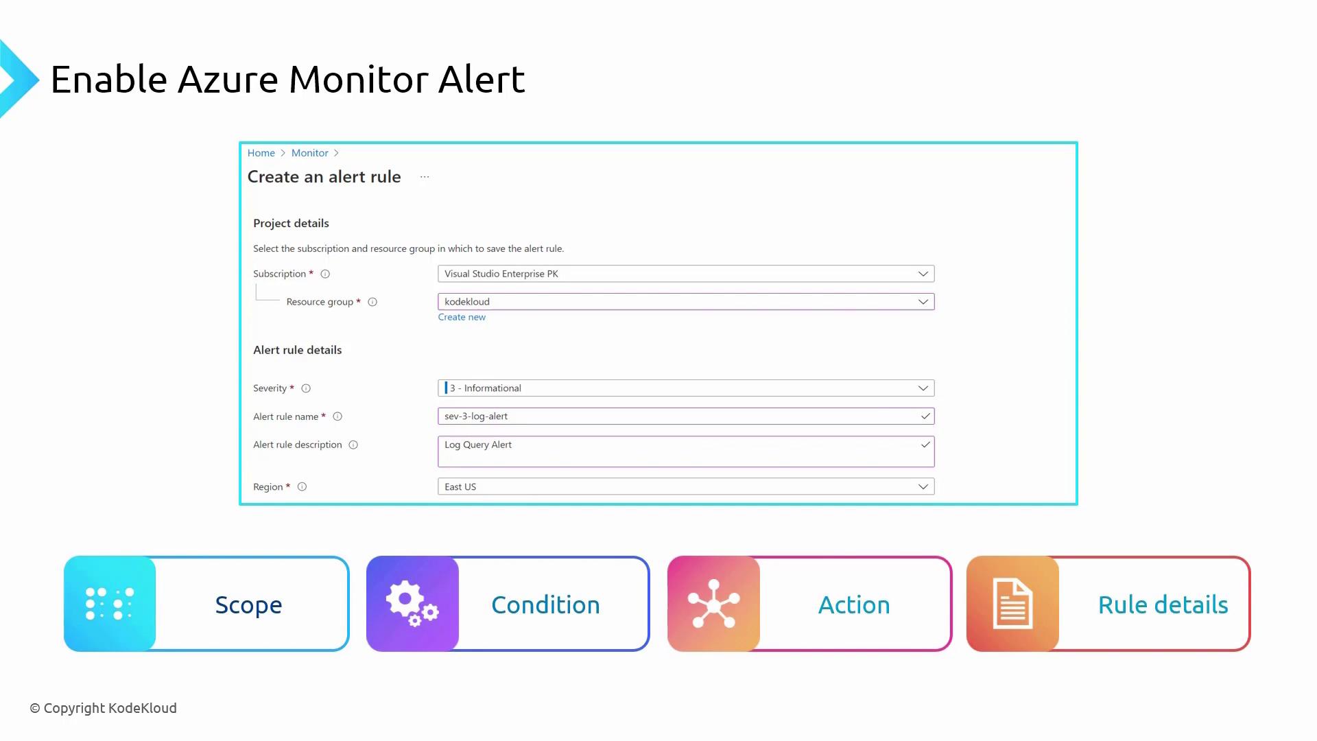 In the Rule Details step, you provide essential information such as the alert rule’s name, description, and severity. This metadata is used in notifications to help you prioritize and manage alerts effectively.